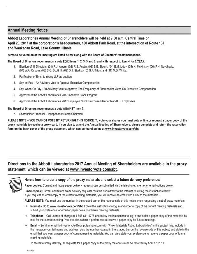 . Abbott Laboratories Annual Meeting of Shareholders will be held at 9:00 a.m. Central Time on April 28, 2017 at the corporations headquarters, 100 Abbott Park Road, at the intersection of Route 137 and Waukegan Road, Lake County, Illinois. Items to be voted on at the meeting are listed below along with the Board of Directors recommendations. The Board of Directors recommends a vote FOR Items 1, 2, 3, 5 and 6, and with respect to Item 4 for 1 YEAR. 1. Election of 11 Directors: (01) R.J. Alpern, (02) R.S. Austin, (03) S.E. Blount, (04) E.M. Liddy, (05) N. McKinstry, (06) P.N. Novakovic, (07) W.A. Osborn, (08) S.C. Scott III, (09) D.J. Starks, (10) G.F. Tilton, and (11) M.D. White. Ratification of Ernst & Young LLP as auditors Say on Pay An Advisory Vote to Approve Executive Compensation Say When On Pay - An Advisory Vote to Approve The Frequency of Shareholder Votes On Executive Compensation Approval of the Abbott Laboratories 2017 Incentive Stock Program Approval of the Abbott Laboratories 2017 Employee Stock Purchase Plan for Non-U.S. Employees 2. 3. 4. 5. 6. The Board of Directors recommends a vote AGAINST Item 7. 7.Shareholder Proposal Independent Board Chairman PLEASE NOTE YOU CANNOT VOTE BY RETURNING THIS NOTICE. To vote your shares you must vote online or request a paper copy of the proxy materials to receive a proxy card. If you plan to attend the Annual Meeting of Shareholders, please complete and return the reservation form on the back cover of the proxy statement, which can be found online at www.investorvote.com/abt. Directions to the Abbott Laboratories 2017 Annual Meeting of Shareholders are available in the proxy statement, which can be viewed at www.investorvote.com/abt. Heres how to order a copy of the proxy materials and select a future delivery preference: Paper copies: Current and future paper delivery requests can be submitted via the telephone, Internet or email options below. Email copies: Current and future email delivery requests must be submitted via the Internet following the instructions below. If you request an email copy of the current meeting materials, you will receive an email with a link to the materials. PLEASE NOTE: You must use the number in the shaded bar on the reverse side of this notice when requesting a set of proxy materials. g Internet Go to www.investorvote.com/abt. Follow the instructions to log in and order a copy of the current meeting materials and submit your preference for email or paper delivery of future meeting materials. Telephone Call us free of charge at 1-866-641-4276 and follow the instructions to log in and order a paper copy of the materials by mail for the current meeting. You can also submit a preference to receive a paper copy for future meetings. Email Send an email to investorvote@computershare.com with Proxy Materials Abbott Laboratories in the subject line. Include in the message your full name and address, plus the number located in the shaded bar on the reverse side of this notice, and state in the email that you want a paper copy of current meeting materials. You can also state your preference to receive a paper copy of future meeting materials. To facilitate timely delivery, all requests for a paper copy of the proxy materials must be received by April 17, 2017. g g 02IONB Annual Meeting Notice