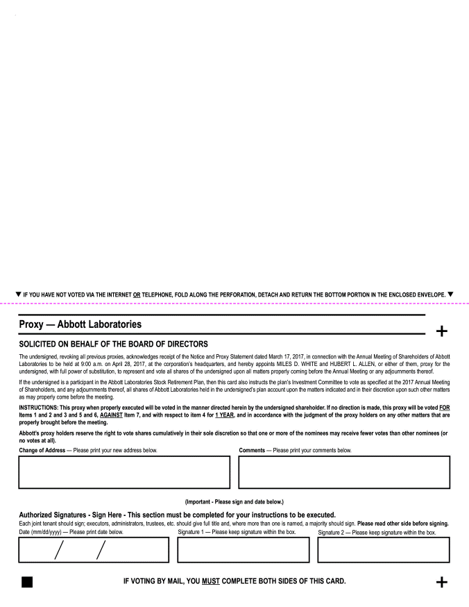 . q IF YOU HAVE NOT VOTED VIA THE INTERNET OR TELEPHONE, FOLD ALONG THE PERFORATION, DETACH AND RETURN THE BOTTOM PORTION IN THE ENCLOSED ENVELOPE. q Proxy Abbott Laboratories + SOLICITED ON BEHALF OF THE BOARD OF DIRECTORS The undersigned, revoking all previous proxies, acknowledges receipt of the Notice and Proxy Statement dated March 17, 2017, in connection with the Annual Meeting of Shareholders of Abbott Laboratories to be held at 9:00 a.m. on April 28, 2017, at the corporations headquarters, and hereby appoints MILES D. WHITE and HUBERT L. ALLEN, or either of them, proxy for the undersigned, with full power of substitution, to represent and vote all shares of the undersigned upon all matters properly coming before the Annual Meeting or any adjournments thereof. If the undersigned is a participant in the Abbott Laboratories Stock Retirement Plan, then this card also instructs the plans Investment Committee to vote as specified at the 2017 Annual Meeting of Shareholders, and any adjournments thereof, all shares of Abbott Laboratories held in the undersigneds plan account upon the matters indicated and in their discretion upon such other matters as may properly come before the meeting. INSTRUCTIONS: This proxy when properly executed will be voted in the manner directed herein by the undersigned shareholder. If no direction is made, this proxy will be voted FOR Items 1 and 2 and 3 and 5 and 6, AGAINST Item 7, and with respect to item 4 for 1 YEAR, and in accordance with the judgment of the proxy holders on any other matters that are properly brought before the meeting. Abbotts proxy holders reserve the right to vote shares cumulatively in their sole discretion so that one or more of the nominees may receive fewer votes than other nominees (or no votes at all). Change of Address Please print your new address below. Comments Please print your comments below. (Important - Please sign and date below.) Authorized Signatures - Sign Here - This section must be completed for your instructions to be executed. Each joint tenant should sign; executors, administrators, trustees, etc. should give full title and, where more than one is named, a majority should sign. Please read other side before signing. Date (mm/dd/yyyy) Please print date below. Signature 1 Please keep signature within the box. Signature 2 Please keep signature within the box. + IF VOTING BY MAIL, YOU MUST COMPLETE BOTH SIDES OF THIS CARD.